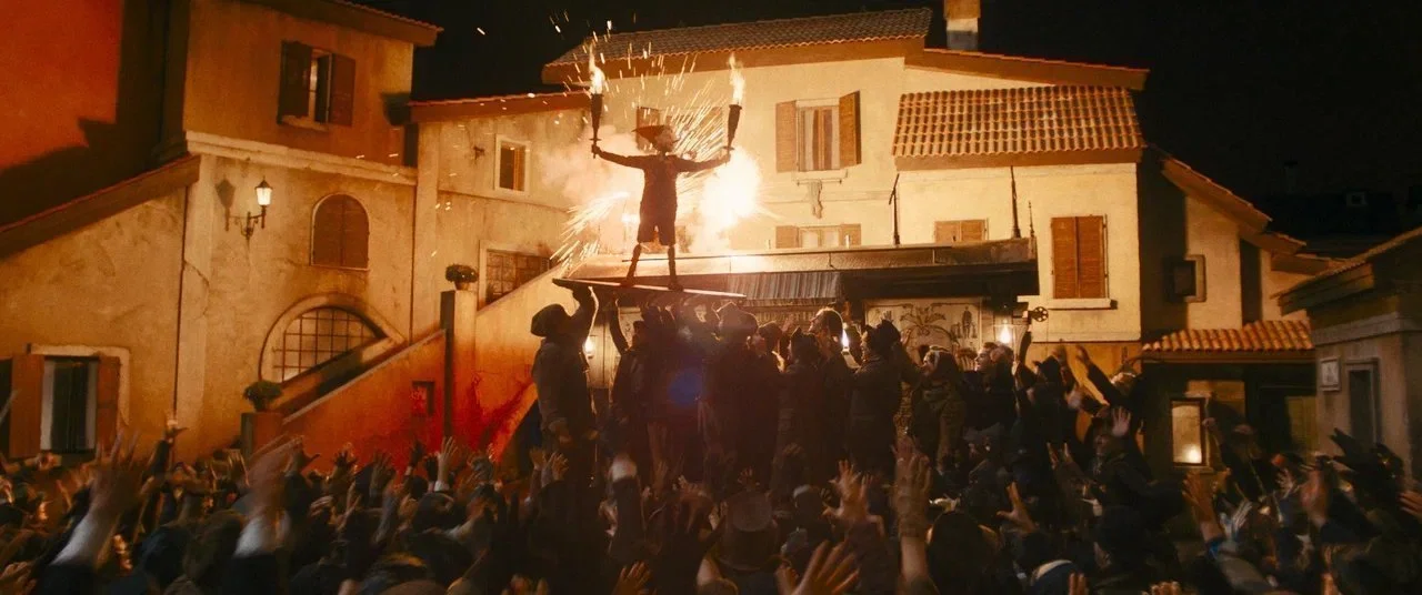 Зрителя с титров предупреждают, что этот «Буратино» - версия «музыкальной сказки Алексея Рыбникова» и вольная экранизация произведения советского писателя Алексея Толстого, который сам вольно интерпретировал “Пиноккио”, так чем Волошин с Золотаревым хуже? Говоря про Рыбникова, авторы отметают многие вопросы о песнях в новом фильме: с кем из правообладателей договорились о текстах песен (за авторством Юрия Энтина их числилось пять штук), а с кем - нет (ко всему, что сочинил Булат Окуджава, придуманы новые тексты, а где-то и вовсе звучит итальянский или псевдоитальянская тарабарщина). Из условного приморского городка на берегу Средиземного моря героев перенесли в конкретный Палермо конца XIX века. Отсюда бунтарский дух некоторых персонажей и революционный настрой толпы с фейерверками и масками подстать «V - значит вендетта».