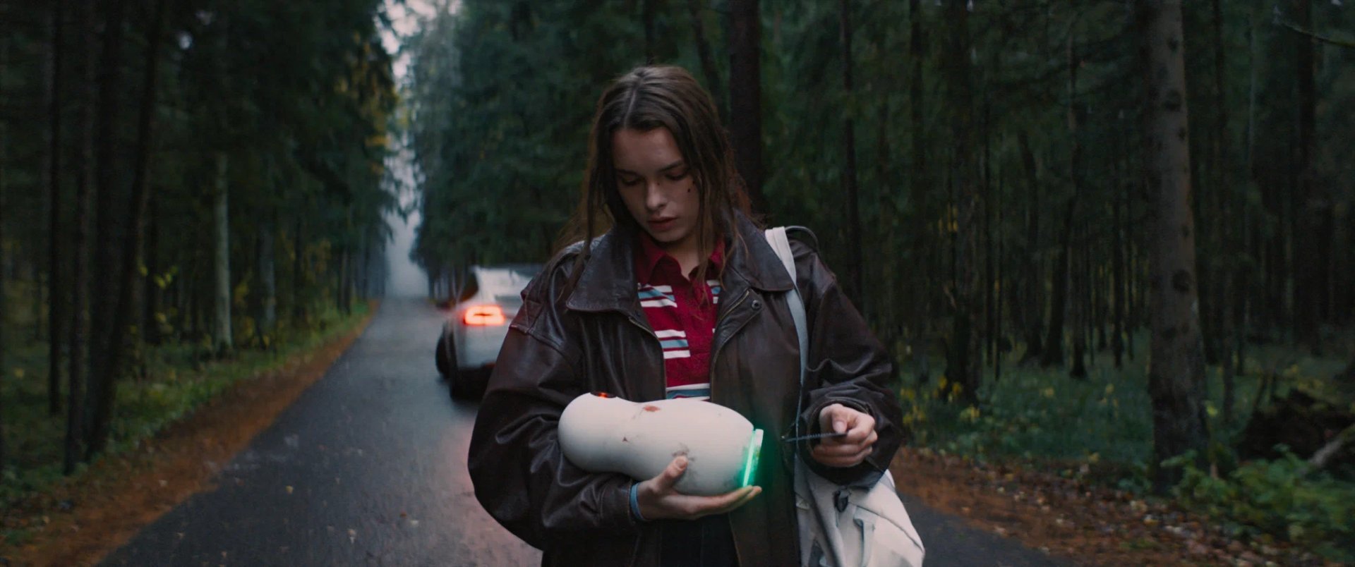 Уже в самом начале, когда у героев Ильи Антоненко и Полины Фединой прямо на трассе посередине непроглядного леса сдыхает электрокар, становится понятно, что праздник будет невесёлым и зрителю нужно готовиться к сюжетным американским горкам. Картинка тоже соответствует: тут и световые блики, как у Джей Джея Абрамса, и красный датчик «Алёны» напоминает о «глазе» HAL 9000.